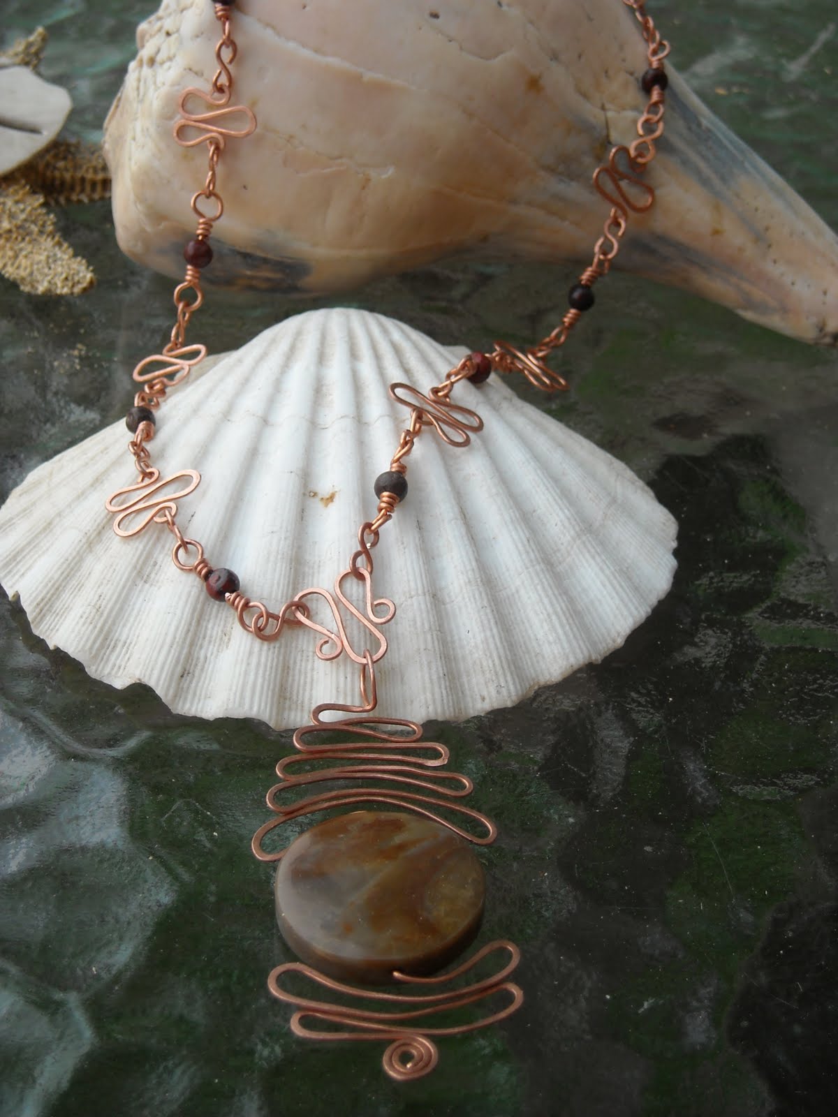 I'm not sure what stone this is but it's an agate of some sort. This piece reminds me of a pebble being thrown in the water creating ripples. The handmade chain, made of genuine copper and round stones is 18 inches long and follows the same theme with the pebble and waves look.
